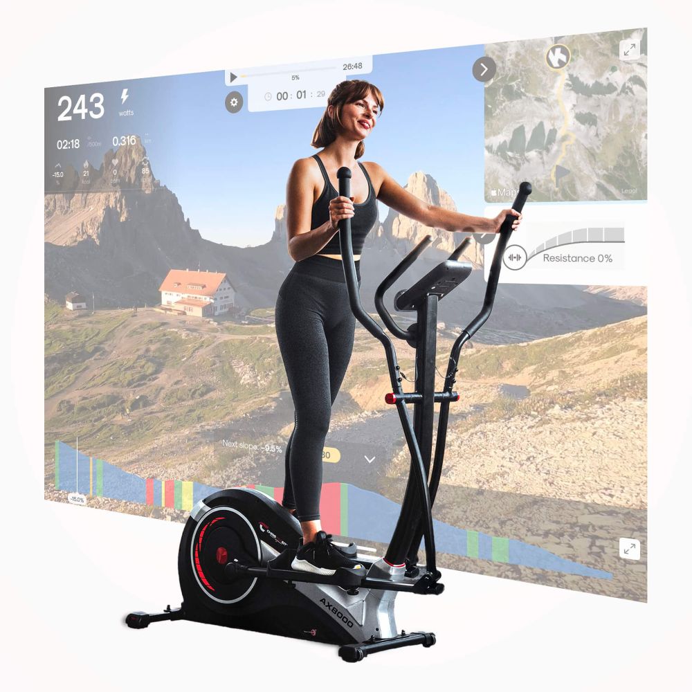 Christopeit AX 8000 on luotettava ja kestävä, jopa 150 kg painaville henkilöille sopiva elliptinen treenaaja. Elliptisen valmentajan avulla voit harjoittaa koko kehoasi tuulesta, sateesta tai vuorokaudenajasta riippumatta. Voit treenata jalkoja ja pakaroita, mutta myös käsiä, hartioita ja selkää. 30 cm:n askelpituus takaa luonnollisen ja hellävaraisen liikkeen. Huoltovapaa magneettijarrujärjestelmä ja hiljainen toiminta 8 kg:n vauhtipyörällä takaavat tasaisen toiminnan. Kinomap-sovellus voidaan yhdistää Bluetoothilla.
