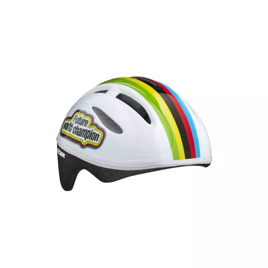 Kypärä Lazer Bob Future Maailmanmestari pyöräilykypärä (46-52 cm) on ainutlaatuinen kypärä lapsille, jotka harrastavat pyöräilyä, rullalautailua tai rullaluistelua. Sen koon ansiosta sitä voivat käyttää lapset, joiden pään ympärysmitta on 46-52 cm.Comfit 3 -asennusjärjestelmän ansiosta kypärä voidaan helposti säätää lapsen päähän sopivaksi. Säätöhihnan avulla kypärä voidaan painaa päätä vasten niin, että se ei liiku, vaikka lapsi kumartuisi. Kypärässä on 6 tuuletusaukkoa, jotka lisäävät ajomukavuutta. Ne mahdollistavat suuremman ilmavirran, mikä suojaa lasta paremmin hikoilulta. Kypärä on turvallisuusstandardien mukainen ja CE-CPSC AS -sertifioitu. Kypärän väri perustuu pyöräilyn maailmanmestarin väreihin - valkoisessa kypärässä on sateenkaariraita (vihreä-kelta-punainen-sininen), jossa on Future World Champion -kirjoitus.
