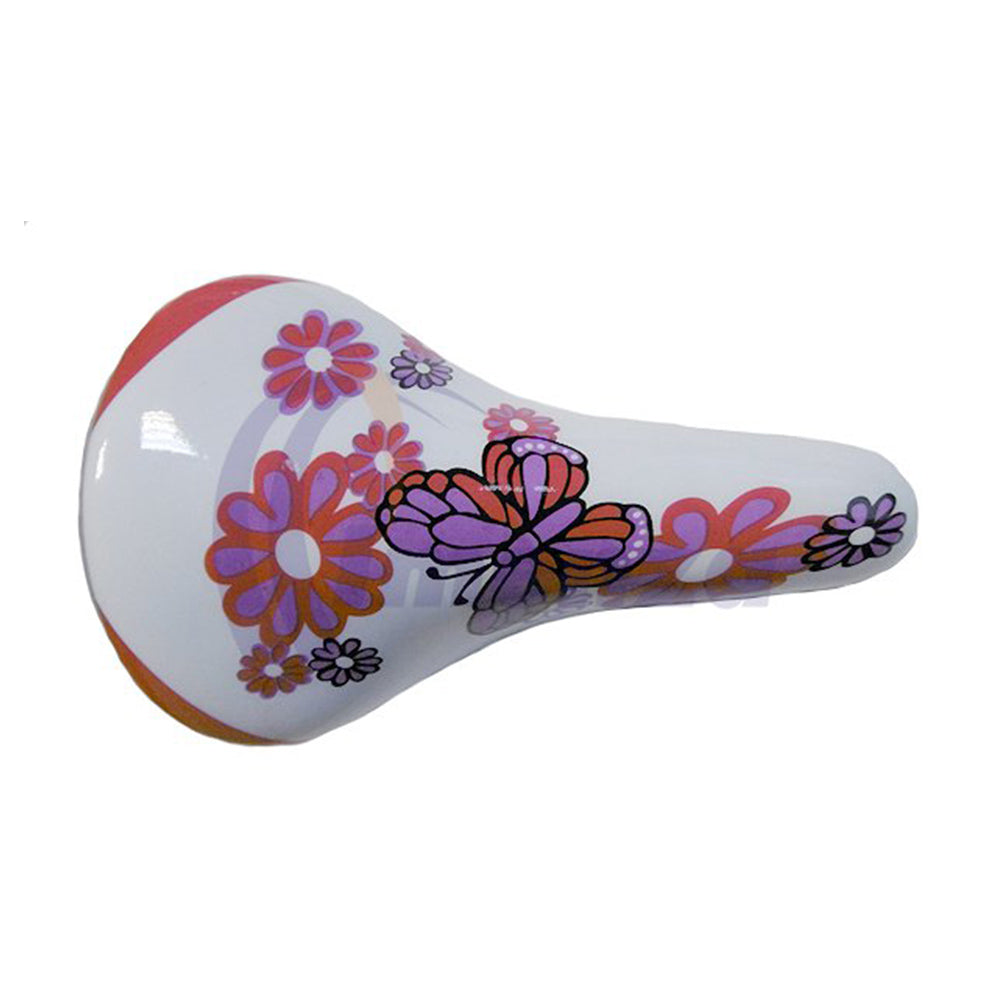 Lasten satula, valkoinen, vaaleanpunainen, kukilla