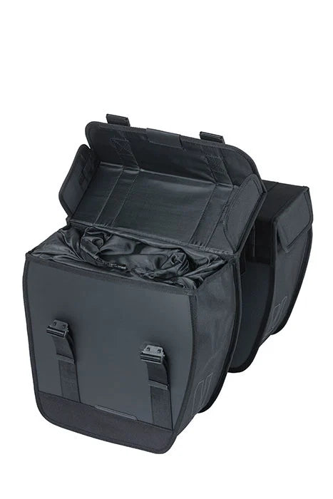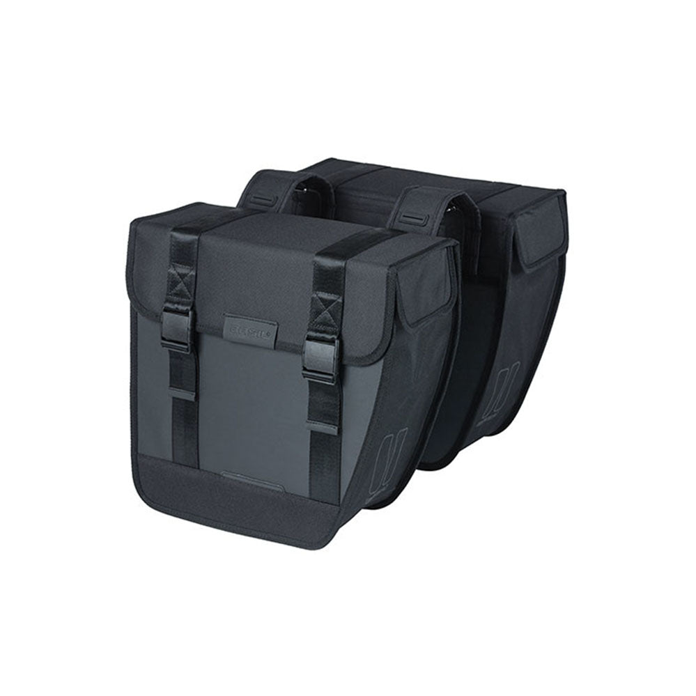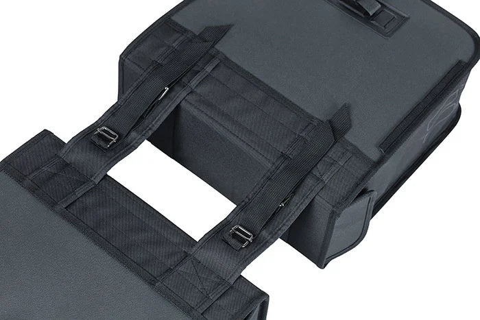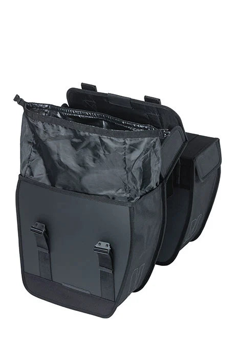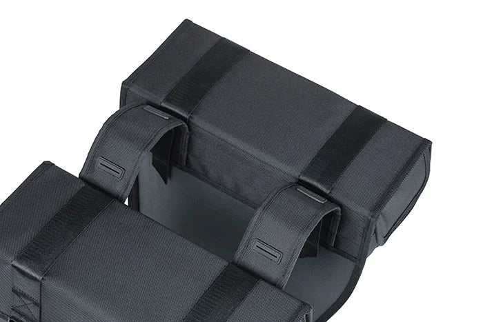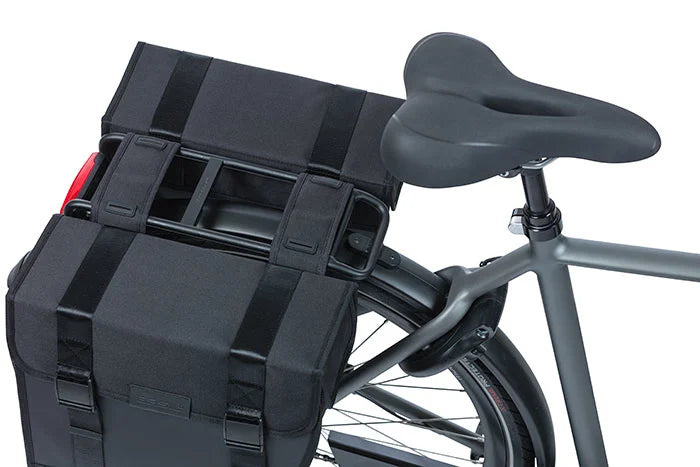 Basil Tour Waterproof on tyylikäs kaksinkertainen pyörälaukku, jonka tilavuus on 25 litraa. Musta laukku sopii sekä miesten että naisten pyörille. Laukku säilyttää muotonsa ja siinä on sadesuojat, jotka estävät veden pääsyn laukkuun. Kaksoispyörälaukku on valmistettu vedenpitävästä 600D-polyesteristä ja päällystetystä kankaasta, ja se säilyttää mittansa.