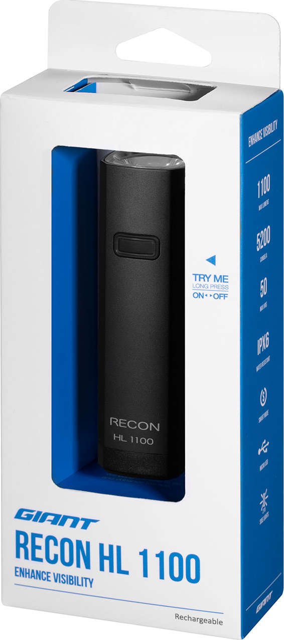 Giant Recon HL 1100 -otsalamppu on pienikokoinen, täyttää ANSI FL-1 -turvallisuusstandardit ja on vedenpitävä (IPX6-standardi - kestää rankkasadetta). Se voidaan kiinnittää sekä pyörään että kypärään*.