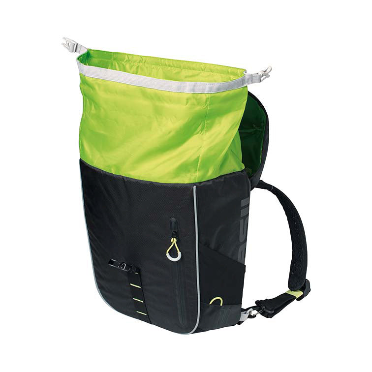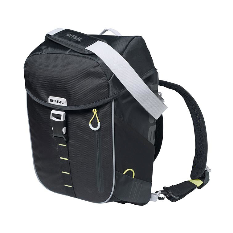 Basil Miles Daypack on myös reppu, joka voidaan helposti kiinnittää ja irrottaa pyörästä. Reppu on tyylikäs ja käytännöllinen - sitä voi käyttää monella eri tavalla. Se on 17 litran kokoinen, ja se on valmistettu vedenpitävästä polyesteristä, ja siinä on tukevampi vuori, joka kestää raskaampia kuormia. Laukussa on heijastavia elementtejä näkyvyyden varmistamiseksi pimeällä. Se kiinnittyy repun runkoon laukun sivussa olevilla läppäkoukuilla, jotka on piilotettu taskun taakse vetoketjulla. Näin et huomaa, että kyseessä on pyörälaukku.