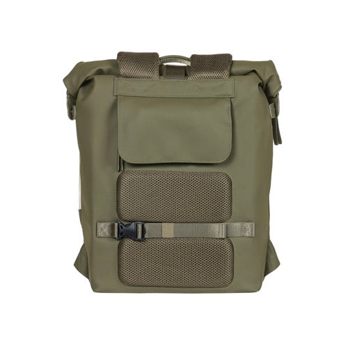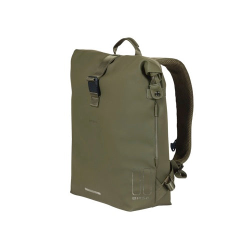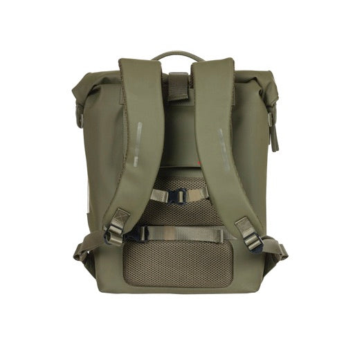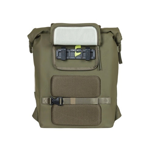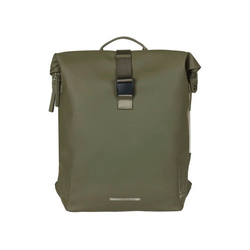 Basil SoHo Nordlicht -pyöräilyreppu tarjoaa useita käteviä ratkaisuja: sisäänrakennettu LED-valo laukun sivussa, vedenpitävät ompeleet, vetoketjullinen ja kokoontaitettava suu, joka pitää veden poissa. Materiaali on pehmeää ja vedenpitävää (IPX3).