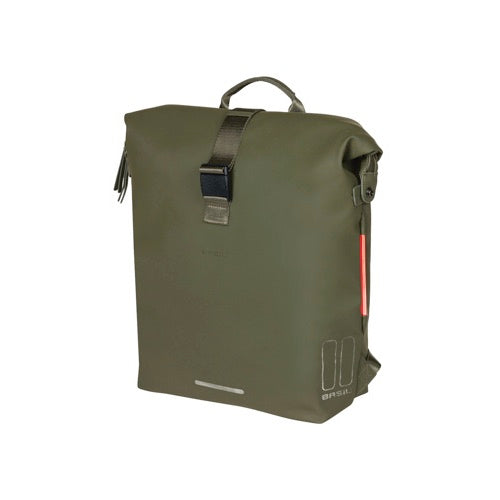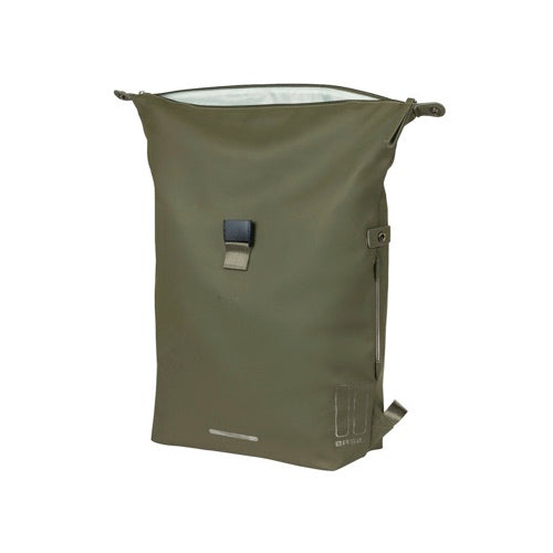 Basil SoHo Nordlicht -pyöräilyreppu tarjoaa useita käteviä ratkaisuja: sisäänrakennettu LED-valo laukun sivussa, vedenpitävät ompeleet, vetoketjullinen ja kokoontaitettava suu, joka pitää veden poissa. Materiaali on pehmeää ja vedenpitävää (IPX3).
