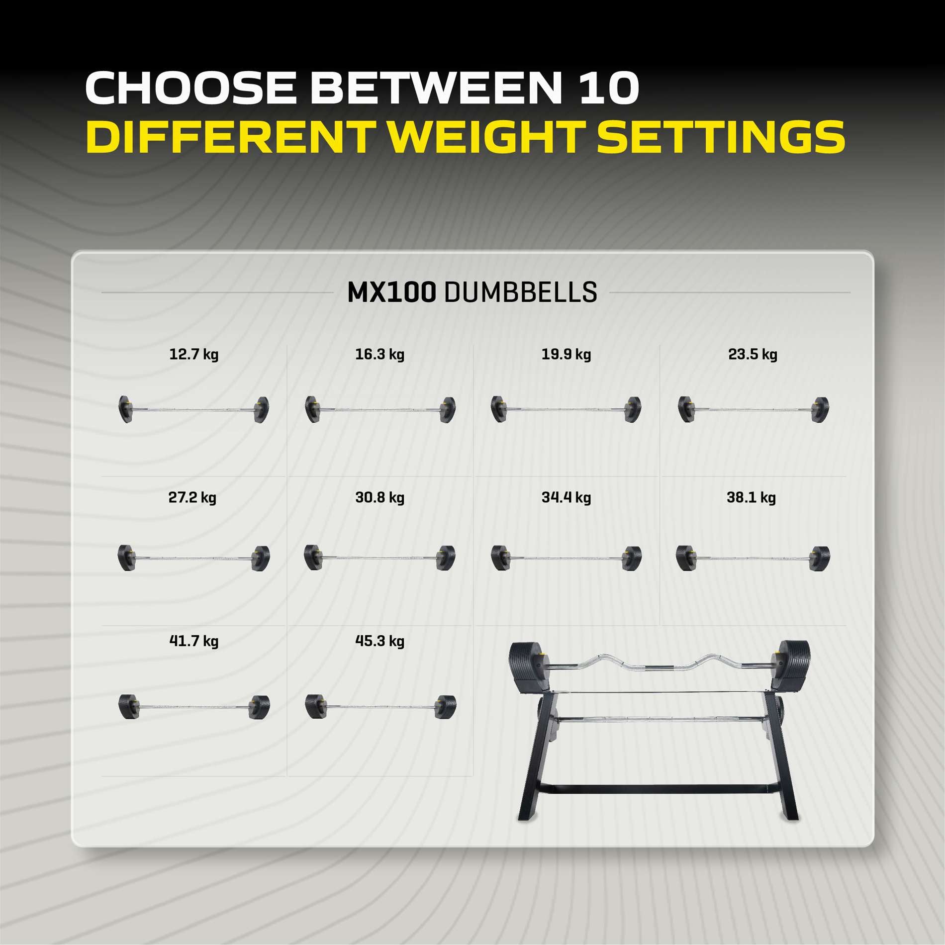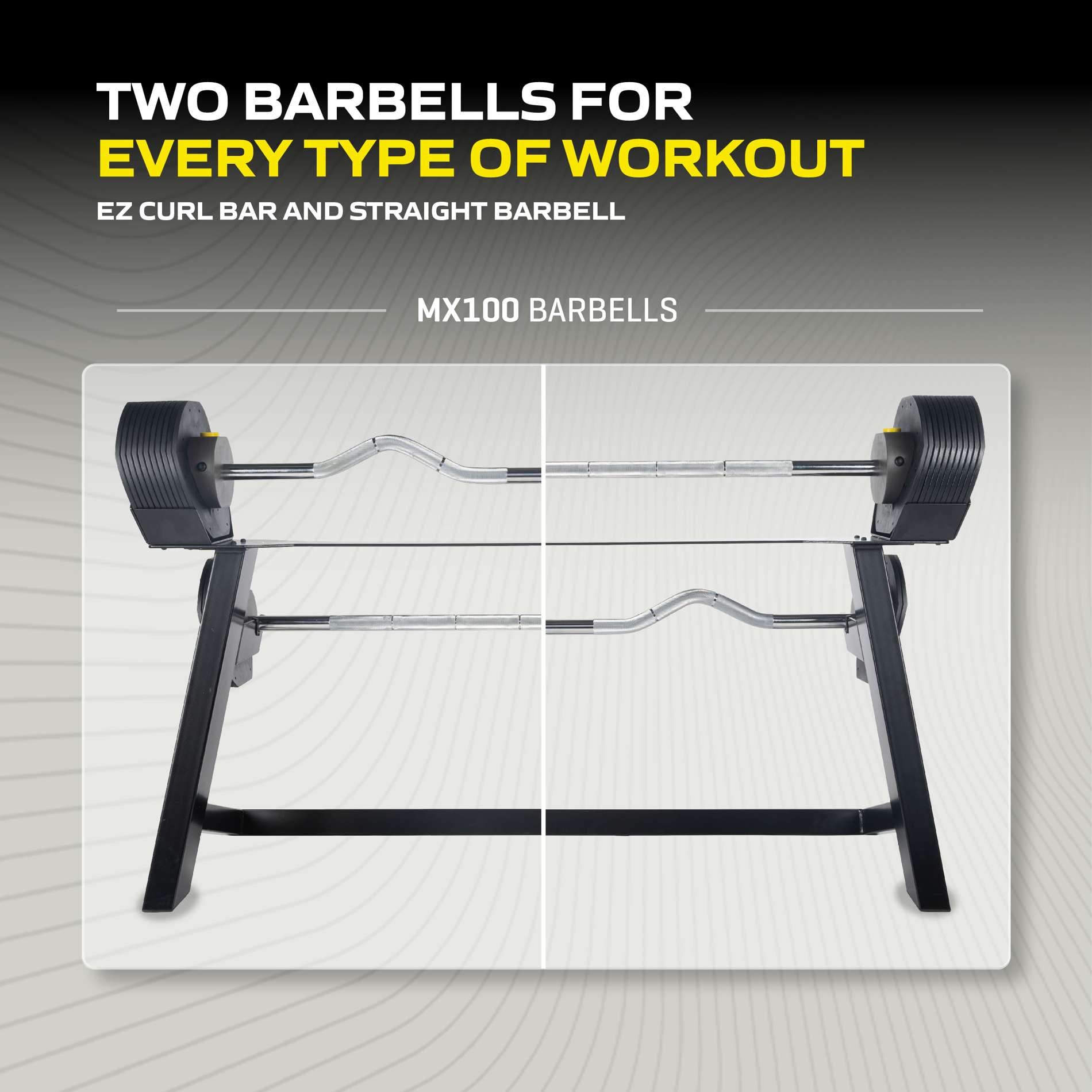 Painolla harjoittelu ei ole koskaan ollut näin helppoa, kompaktia, nopeaa ja turvallista. Tunturin MX100 -pikavipujärjestelmän avulla voit valita oikean painon vain napin painalluksella. Patentoitu lukitusjärjestelmä pitää painolevyt tukevasti paikoillaan, mikä takaa turvallisen harjoittelun joka kerta. Setti sisältää suoran tangon, EZ-curve-tangon, 45,3 kg painot ja tyylikkään, tilaa säästävän säilytyskehikon.
