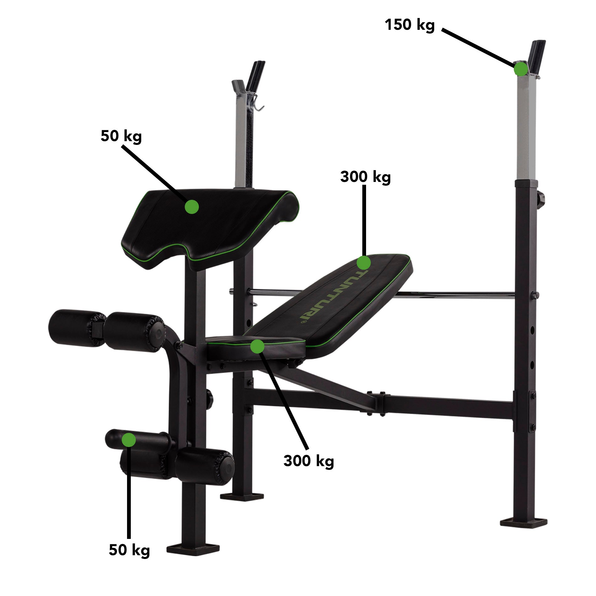 Maksimikuormituskapasiteetti - On tärkeää tietää laitteesi maksimikuormituskapasiteetti osissa. Löydät sen oikealla olevista kuvista. Kun vähennät maksimikapasiteetista kehon painosi, tiedät, kuinka paljon painoa voit nostaa. Lasket kehon painon mukaan vain, jos on osia, joiden päällä voit istua tai maata. Esimerkki.