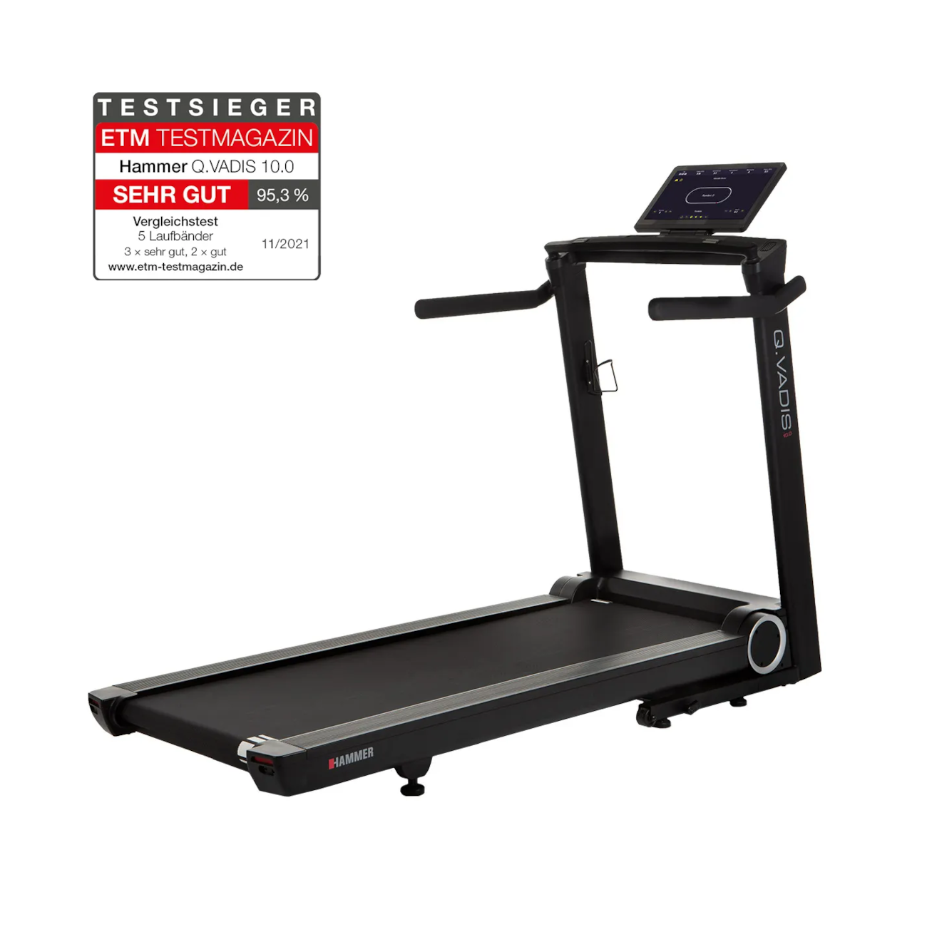 Etsitkö juoksumattoa, joka täyttää kaikki tarpeesi? Sen on oltava moderni ja siinä on oltava suuri kosketusnäyttö? Valitse sitten Hammer Q -juoksumatto. VADIS 10.0! Treenaa mukavasti omassa kodissasi ja tee uusi henkilökohtainen ennätys. Q. VADIS 10.0:n älykkäät juoksuominaisuudet ovat ansainneet sille ETM TEST WINNER 11/2021 -tittelin, ja ne saavat varmasti jokaisen juoksijan sydämen sykkimään.