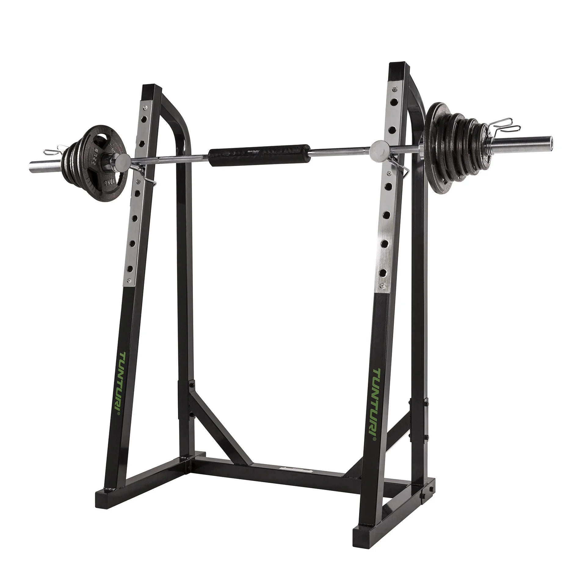 Korkeussäätö - Voit tehdä esimerkiksi kyykkyjä, jalkojen nostoja, lungeja, deadliffejä tai deadliffejä. Aseta painonnostotanko kynnykselle ennen harjoitusta, harjoituksen aikana ja sen jälkeen. Rungossa on kaksi kromattua tankotukea, jotka voidaan säätää 7 eri korkeuteen. Vaihteluväli 90-150 cm (35,4-59,1 tuumaa). Aseta painonnostotanko sinulle mukavalle korkeudelle. Tämä voi vaihdella harjoituksesta riippuen.
