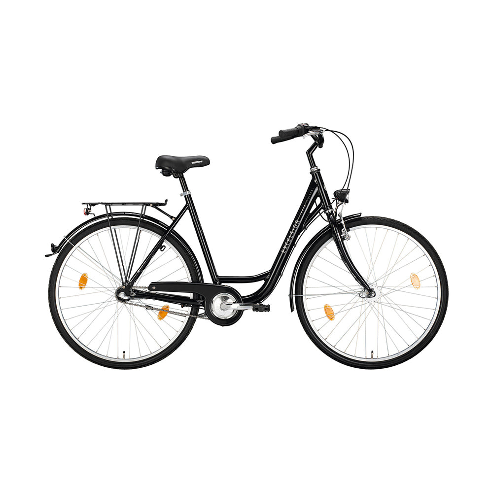 Pyörän mukana toimitetaan kaikki lisävarusteet: metalliset lokasuojat, etu- ja takavalot, potkulaite, tukeva tavarateline ja ketjusuoja.