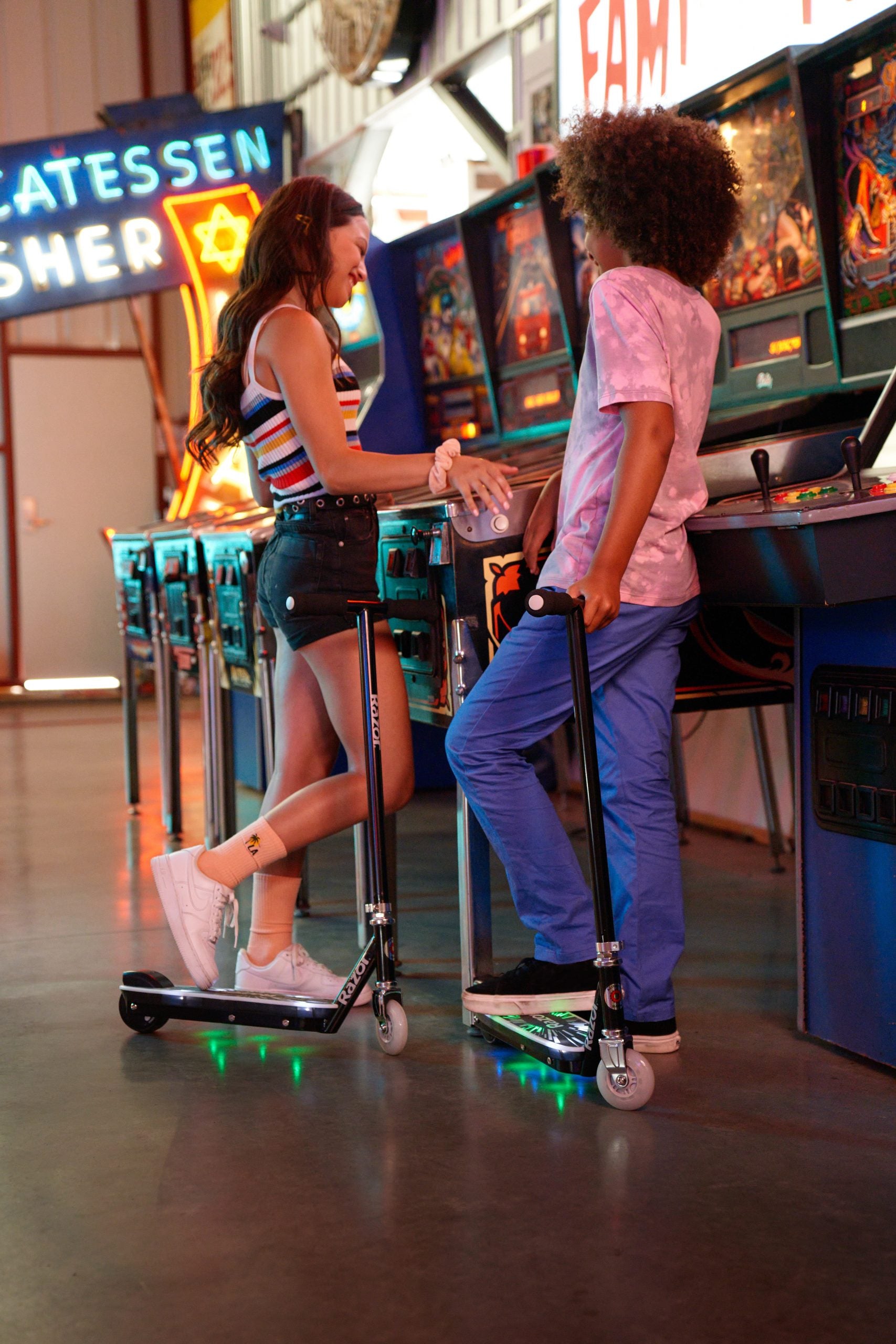 Razorin sähköinen Tekno-skootteri tuodaan aina lasten diskoon. Moniväriset LED-valot ovat jalustan päällä ja alla sekä etupyörän sisällä. Moottori on takapyörässä, skootterin käynnistät painamalla vipua. Nopeuden lisäämiseksi paina alustaa ja pysähtyäksesi paina takapyörän napaa. Kiihdytys on tasainen eikä liian äkillinen, sopii lapsille. Nopeus on jopa 12 km/h ja ajo kestää 30 minuuttia.